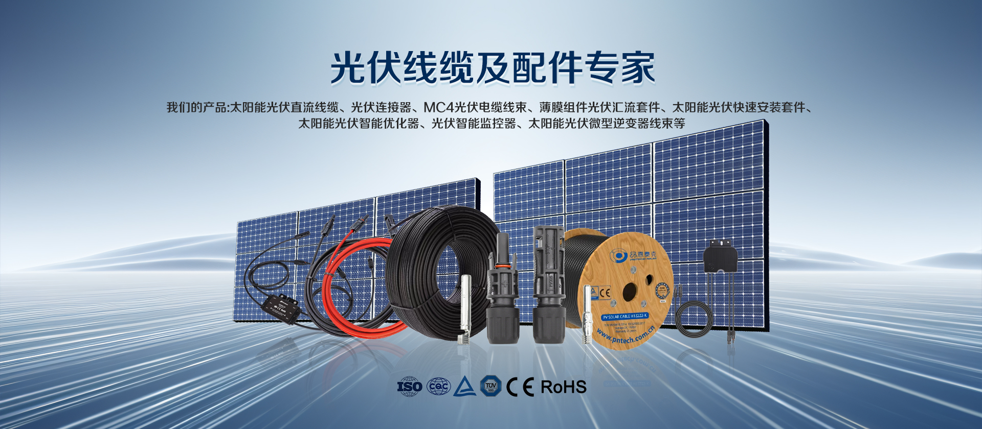 品恩泰克成立于2011年,是一家集太陽能配件生產、銷售、研發及服務為一體的高新技術企業。目前業務涵蓋太陽能光伏電纜、光伏連接器、光伏延長線、光伏匯流套件、微型逆變器線束及光伏鏈接領域應用產品等的生產及銷售。具備提供一站式太陽能能源方案的能力,為客戶提供高品質光伏電纜及配件產品,并提供安裝和能源配套方案支持。